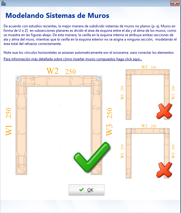 Si se selecciona el botón para insertar un Muro Compuesto, una ventana informativa aparecerá proponiendo la mejor manera de insertar secciones de muros compuestos. De acuerdo con investigaciones recientes, la mejor manera de subdividir sistemas no planares de muros, es decir muros con forma de U o Z, en secciones es dividiendo el área de la esquina entre el ala y los muros. De esta manera, la varilla esquinera interna se atribuye a ambos el alma y el ala de la sección, mientras que la varilla exterior no se asigna a ninguna sección, modelando correctamente así el área total de refuerzo.