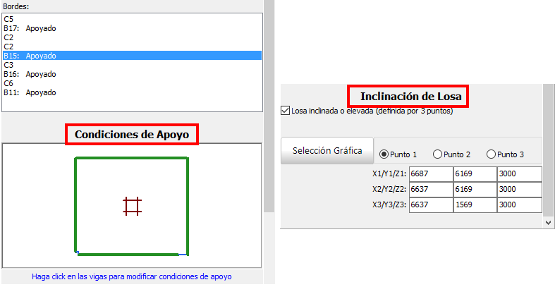 Luego de definir una losa, los usuarios pueden modificar sus condiciones de apoyo, ajustando así las vigas en las cuales se distribuye la carga de las losas. Adicionalmente la inclinación de la losa puede modificarse, especificando la elevación en tres puntos que pueden seleccionarse gráficamente. La elevación de las vigas vecinas y la altura de columna se ajustarán automáticamente y las columnas se subdividirán en miembros cortos de requerirlo así el programa, p. ej. en casos donde dos o más vigas están apoyadas en la misma columna a niveles diferentes, creándose así columnas cortas.