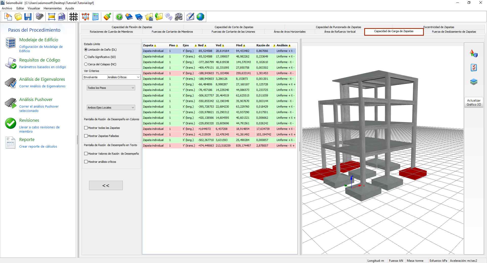 En este módulo se pueden visualizar los resultados de las revisiones de capacidad portante de zapatas individuales y corridas, según el Código seleccionado. Los usuarios pueden seleccionar para qué Estado Límite u objetivo de Rendimiento ver los resultados y elegir filtros, que incluyen la determinación del análisis, el suelo y el eje local. Los estados límite disponibles son aquellos ya seleccionados en el módulo Estados Límite en Requisitos del Código. Además, en el menú desplegable para la selección de análisis aparte de los análisis ejecutados existe una opción llamada Análisis Crítico, que es la envolvente de los resultados de todos los análisis. Los elementos que han superado su capacidad portante se marcan en rojo tanto en la vista de tabla como en el formato de vista 3D, estando disponibles diferentes opciones de visualización. Por ejemplo, los usuarios pueden seleccionar mostrar los índices de rendimiento de las zapatas o el análisis crítico de cada zapata en el gráfico 3D, o mostrar las zapatas con diferentes colores, dependiendo del valor de su índice de rendimiento para el estado límite seleccionado.
