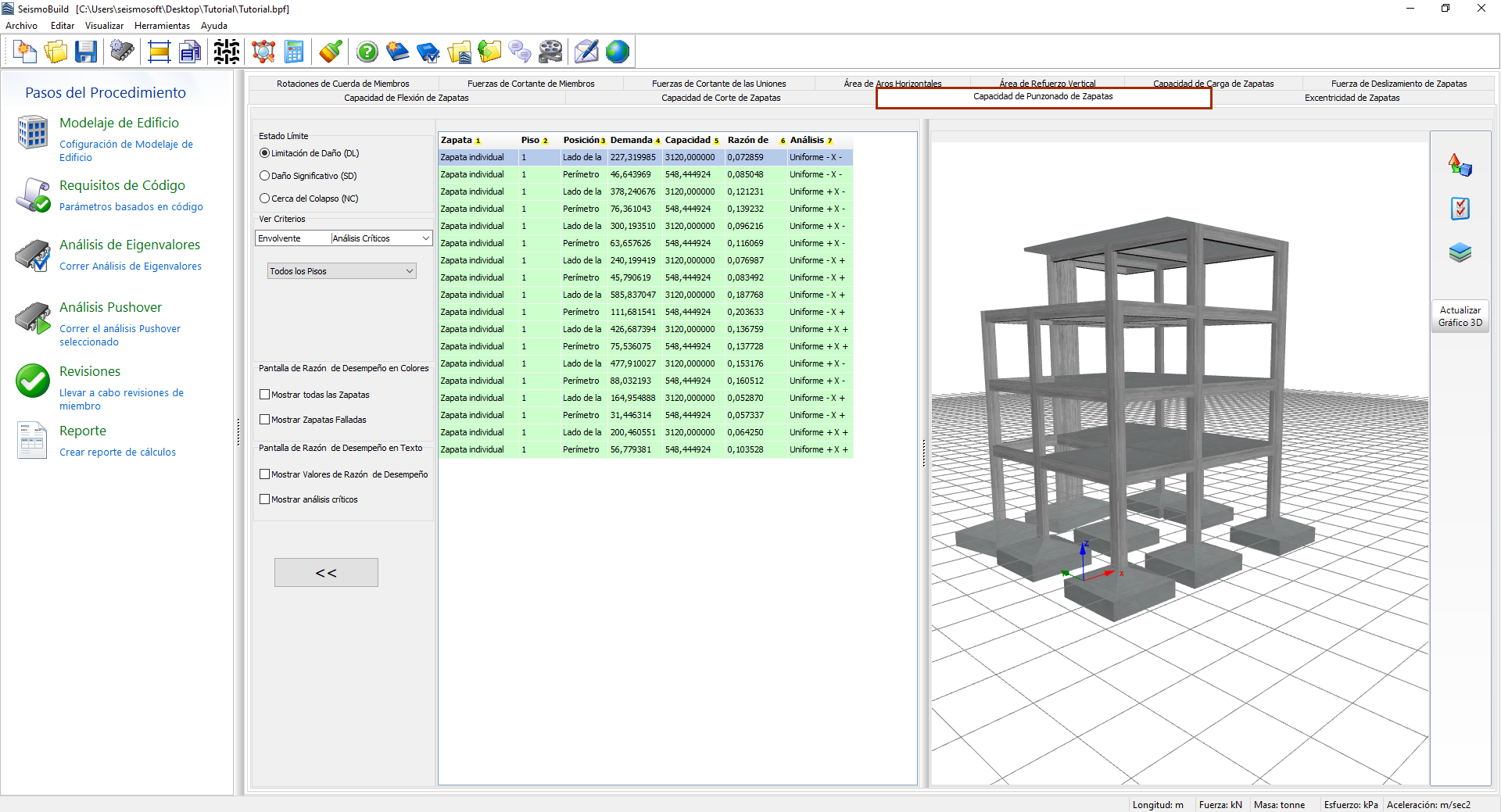 En este módulo se pueden visualizar los resultados de las revisiones de capacidad de Punzonamiento de zapatas individuales y corridas, según el Código seleccionado. Los usuarios pueden seleccionar para qué Estado Límite u objetivo de Rendimiento ver los resultados y elegir filtros, que incluyen la determinación del análisis, el suelo y el eje local. Los estados límite disponibles son aquellos ya seleccionados en el módulo Estados límite en Requisitos del código. Además, en el menú desplegable para la selección de análisis aparte de los análisis ejecutados existe una opción llamada Análisis Crítico, que es la envolvente de los resultados de todos los análisis. Los elementos que han superado su capacidad de Punzonamiento se marcan en rojo tanto en la vista de tabla como en el formato de vista 3D, estando disponibles diferentes opciones de visualización. Por ejemplo, los usuarios pueden seleccionar mostrar los índices de rendimiento de las zapatas o el análisis crítico de cada zapata en el gráfico 3D, o mostrar las zapatas con diferentes colores, dependiendo del valor de su índice de rendimiento para el estado límite seleccionado.