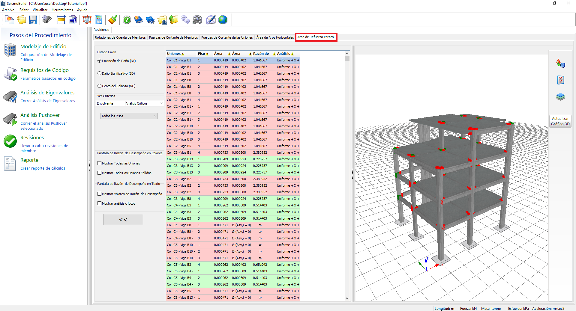 Aquí se exportan los resultados de la revisión del área del refuerzo vertical en las uniones viga-columna (esta revisón aplica solamente para el Eurocódigo 8). Los usuarios pueden seleccionar, para cada Estado Límite u Objetivo de Desempeño, ver los resultados y escoger filtros, que incluyen el número de análisis y el piso. Los estados límite disponibles son aquellos seleccionados en el módulo de Estados Límite y de Requisitos de Código. Además, en el menú desplegable para la selección de análisis, aparte de los análisis ejecutados hay una opción llamada Análisis Crítico, el cual es la envolvente de los resultados de todos los análisis. Las uniones que incumplen la revisión se marcan con rojo en la tabla y la vista 3D ,mientras que las diferentes opciones de visualización están disponibles. Por ejemplo, los usuarios pueden seleccionar mostrar los índices de desempeño de los miembros o el análisis crítico de cada miembro en el gráfico 3D, o mostrar los elementos con diferentes colores, dependiendo del valor de su relación de desempeño para el estado límite seleccionado.