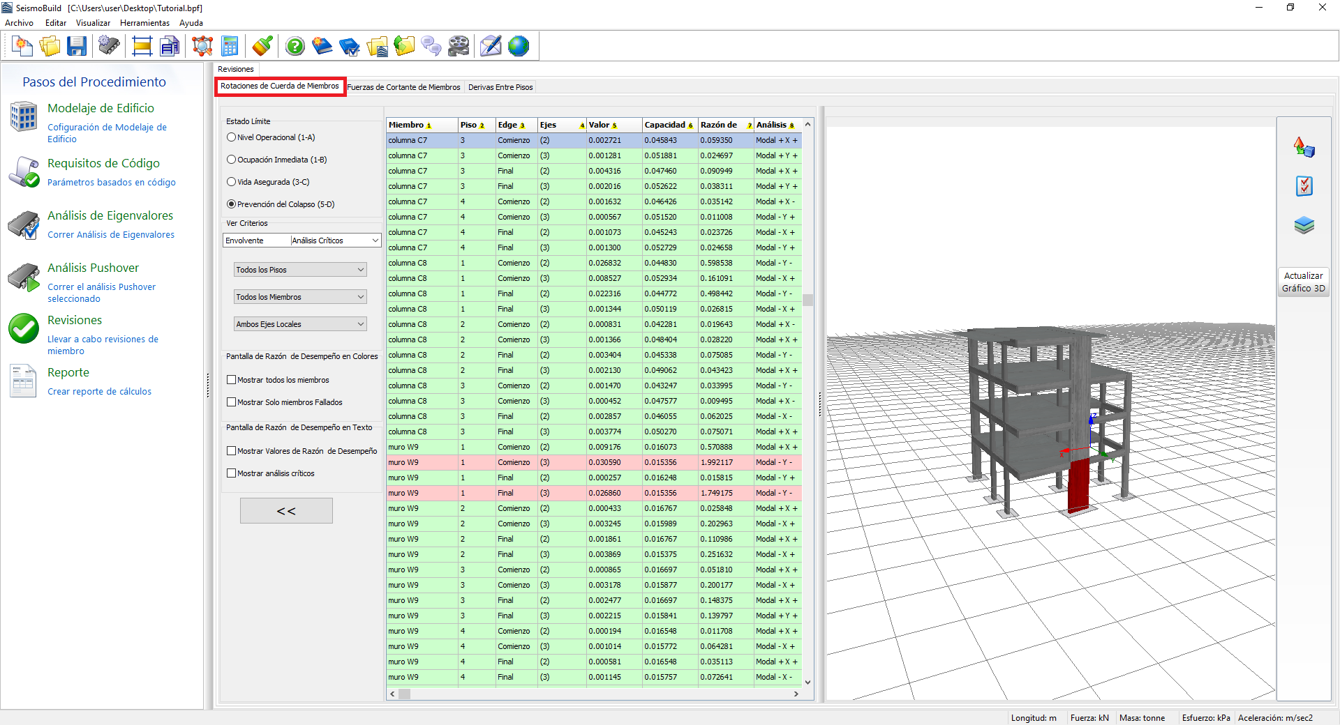 Aquí se exportan los resultados de las revisiones de las fuerzas de cortante para las uniones de viga-columna, de acuerdo con el Código seleccionado (esta revisión aplica para los Eurocódigos, el ASCE 41-13 y TBDY). Los usuarios pueden seleccionar para qué Estado Límite u Objetivo de Desempeño, ver los resultados y elegir filtros, que incluyen la determinación del análisis y del piso. Los estados límite disponibles son los ya seleccionados en el módulo Estados Límite de Requisitos de Código. Además, en el menú desplegable de la selección de análisis, aparte de los análisis ejecutados, existe una opción denominada Análisis Crítico, que es la envolvente de los resultados de todos los análisis. Los elementos que han excedido su capacidad de corte están marcados con rojo tanto en la vista de tabla como en el formato de vista 3D, mientras que las diferentes opciones de visualización están disponibles. Por ejemplo, los usuarios pueden seleccionar mostrar las relaciones de rendimiento de las uniones o el análisis crítico de cada unión en la representación 3D, o mostrar las uniones con diferentes colores, dependiendo del valor de su relación de rendimiento para el estado límite seleccionado.