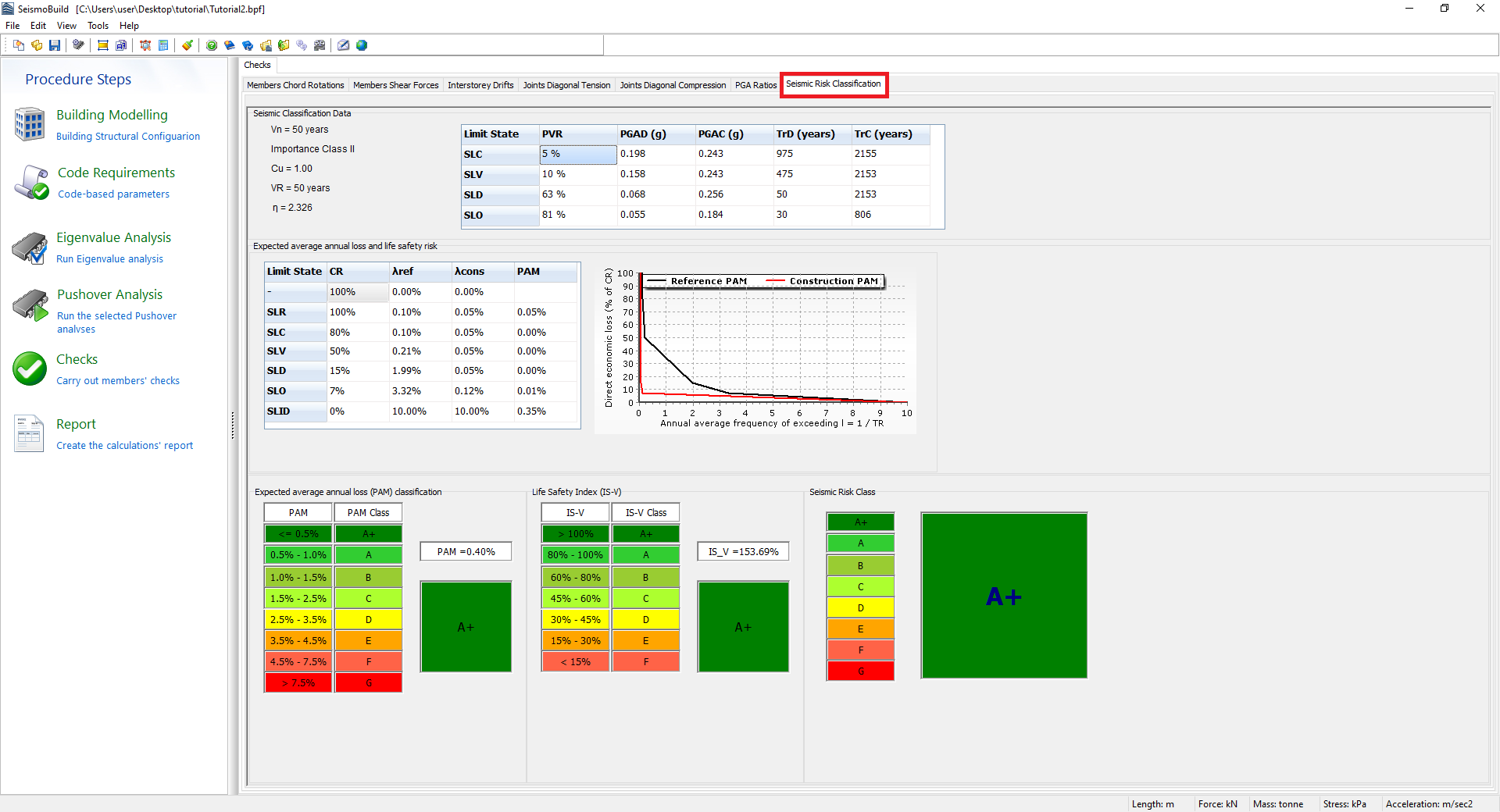 La Clasificación de Riesgo Sísmico (especificada solo en NTC) es un índice que corresponde a una escala del peligro sísmico al que está expuesto un edificio, desde G (riesgo sísmico más alto) hasta A + (riesgo sísmico más bajo). Se define como el peor de los dos índices parciales, la pérdida anual promedio esperada (PAM) y el índice de seguridad de vida (IS-V). Para el cálculo de los índices antes mencionados, se requieren las relaciones de PGA para los estados límite de Seguridad de Vida y Limitación de Daño, por lo que estos estados límite deben seleccionarse en el Módulo de Requisitos de Código/Estados Límite. La selección de los estados Límite de Nivel Operacional y Prevención de Colapso no es obligatoria, sin embargo, si se seleccionan, el procedimiento dará como resultado una clasificación más precisa. Los valores más bajos calculados de las relaciones de PGA para todos los tipos de revisión y los análisis pushover se consideran en la determinación de la Clasificación de Riesgo Sísmico. La información sobre estos parámetros se puede encontrar en las Regulaciones Italianas.