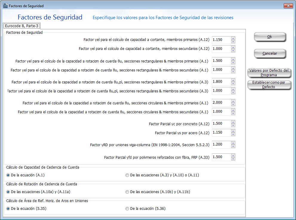 Los valores de los factores de seguridad utilizados en las revisiones pueden especificarse a través del botón correspondiente. Los factores por defecto del programa son aquellos definidos en el Código seleccionado.