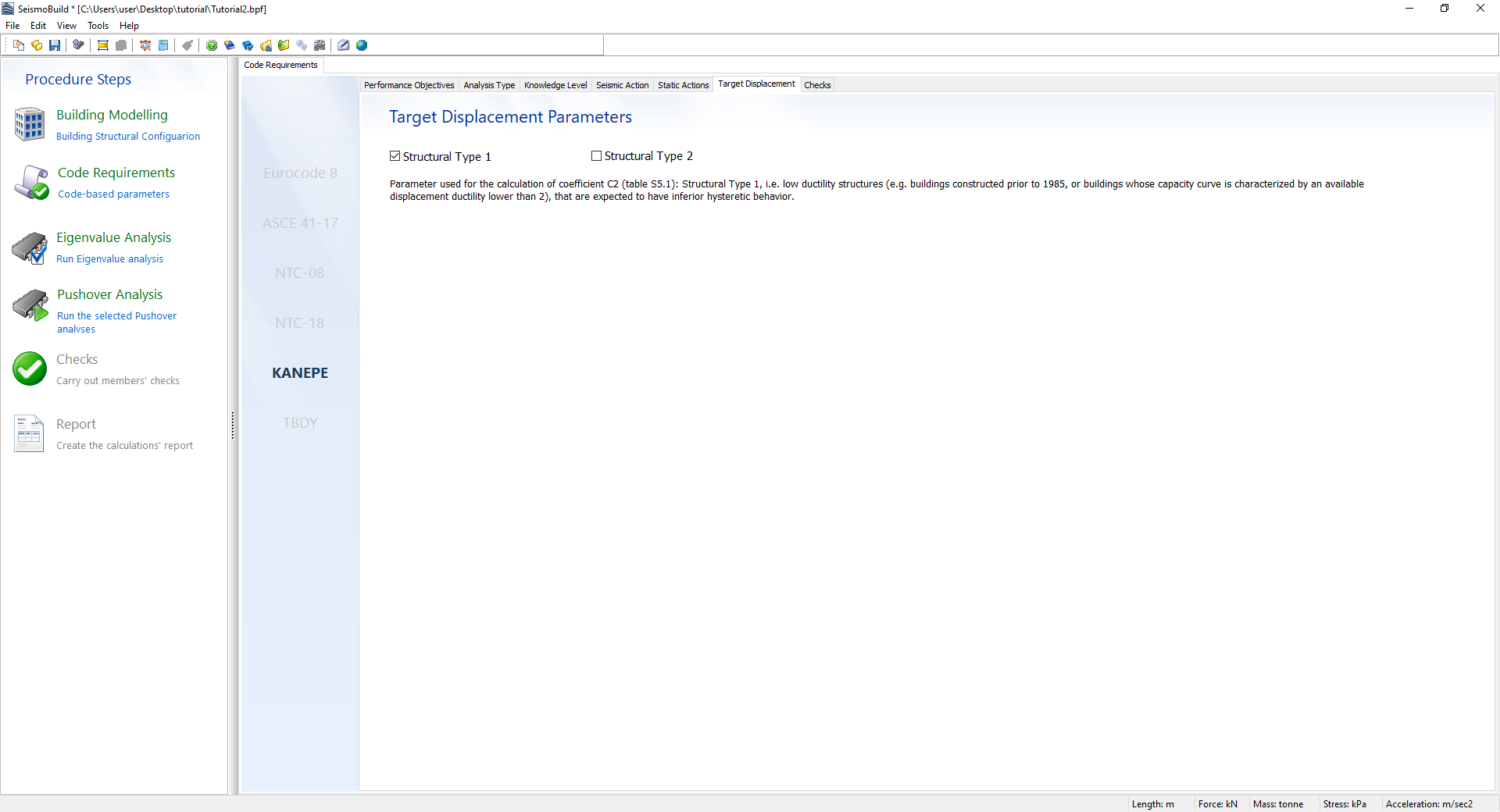 Aquí el tipo estructural de edificio se especifica para la definición adecuada del factor C2, tomado en consideración en el cálculo del Desplazamiento Objetivo de KANEPE. Debe notarse que el factor C2 toma en cuenta la influencia de la forma de la curva de histéresis en el desplazamiento máximo.