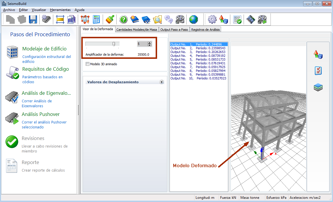 Con el Visor de la Deformada, los usuarios tienen la posibilidad de visualizar la deformada del modelo en cada paso del análisis (haciendo doble clic sobre el identificador del output deseado para actualizar la vista de la deformada).