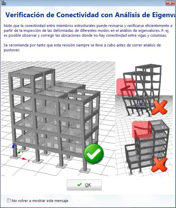 Cuando el análsis se completa un mensaje informativo aparece sugiriendo revisar las deformadas de los diferentes modos, para encontrar posibles problemas de conectividad entre vigas y columnas.