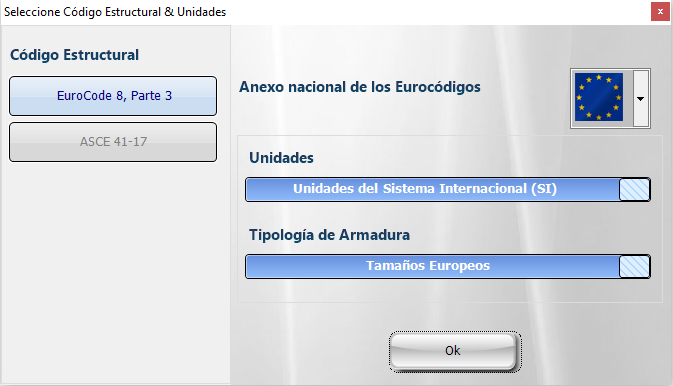 Abra SeismoBuild, seleccione el Código estructural del nuevo proyecto, las unidades, la tipología de varilla y