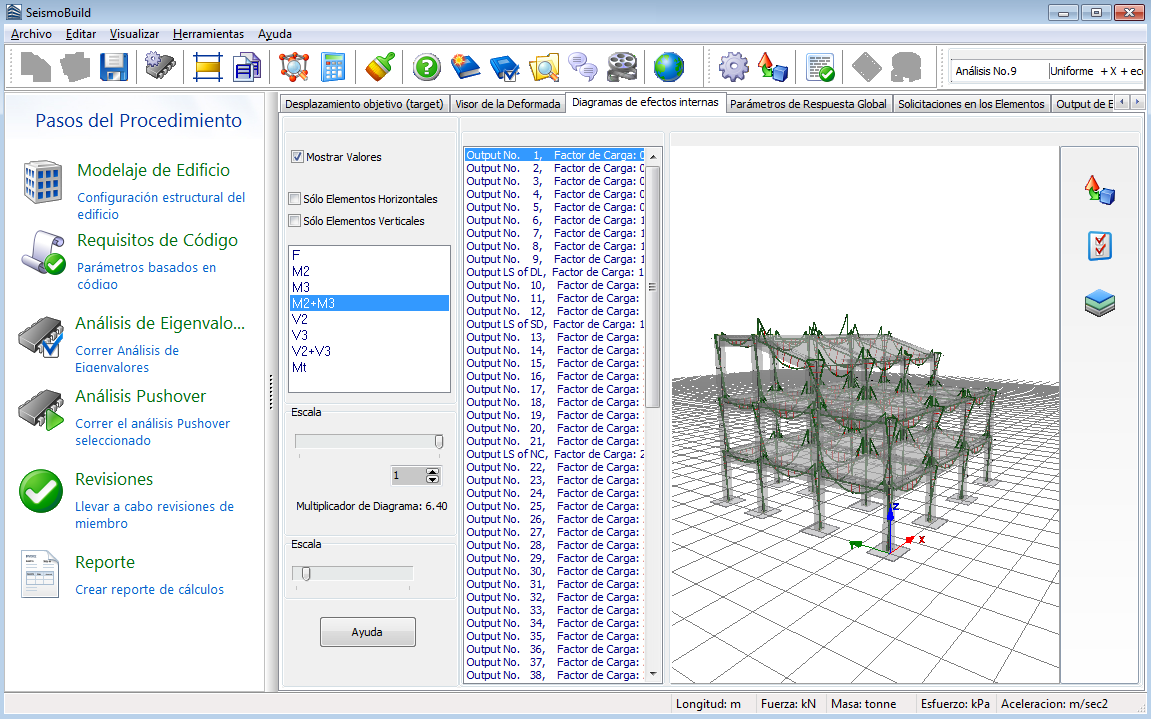 Los diagramas de fuerzas internas (axial y cortante) y los momentos (flexión y torsión) se proveen en gráficos 3D. De forma predeterminada los diagramas para los elementos verticales y horizontales se muestran en el mismo gráfico. Si el usuario desea obtener los diagramas por separado (solamente vertical u horizontal), deben marcar la casilla correspondiente. La posibilidad de escalar los diagramas y el espesor de las líneas también está disponible.
