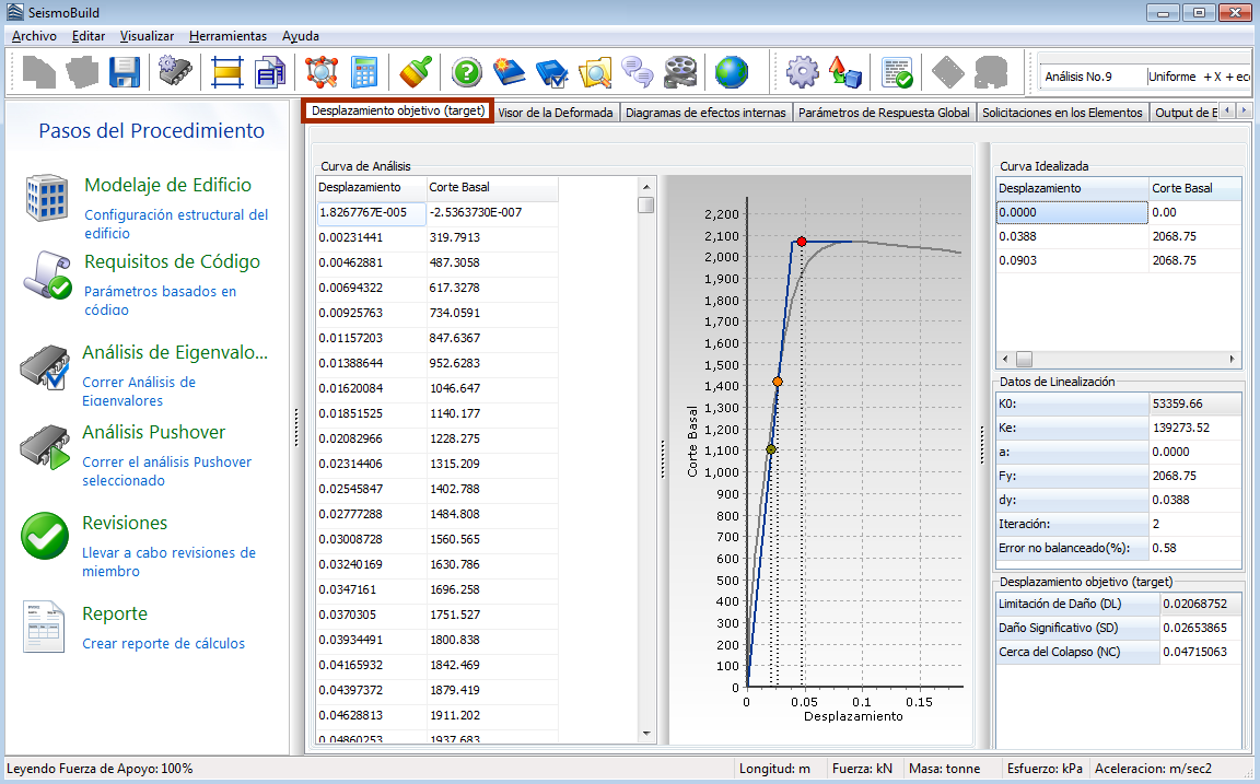 En el módulo de Desplazamiento Objetivo, se muestran las curvas de capacidad antes y despues de la linealización que corresponde al análisis pushover seleccionado, así como los valores del desplazamiento objetivo para los estados límite seleccionados. Aquí también se provee información sobre el proceso de linealización. Los usuarios pueden referirse a los Eurocódigos, ASCE, NTC-18, KANEPE o TBDY, para más información sobre el cálculo del desplazamiento objetivo.