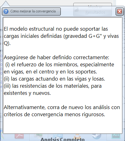 Cuando los análsis se completan, un mensaje aparece proporcionando la información sobre la ejecución de los mismos. En particular, el mensaje informa si el proceso en su totalidad fue llevado a cabo con éxito (es decir, todos los análisis han alcanzado el desplazamiento máximo definido o se han completado todos los pasos de las tiempo-historias definidos en el análisis dinámico), o si el solucionador de SeismoBuild no pudo ejecutar todos los análisis hasta el final, debido a dificultades de convergencia. En el último caso, el mensaje informa sobre el porcentaje de desplazamiento máximo alcanzado cuando se terminó el análisis.