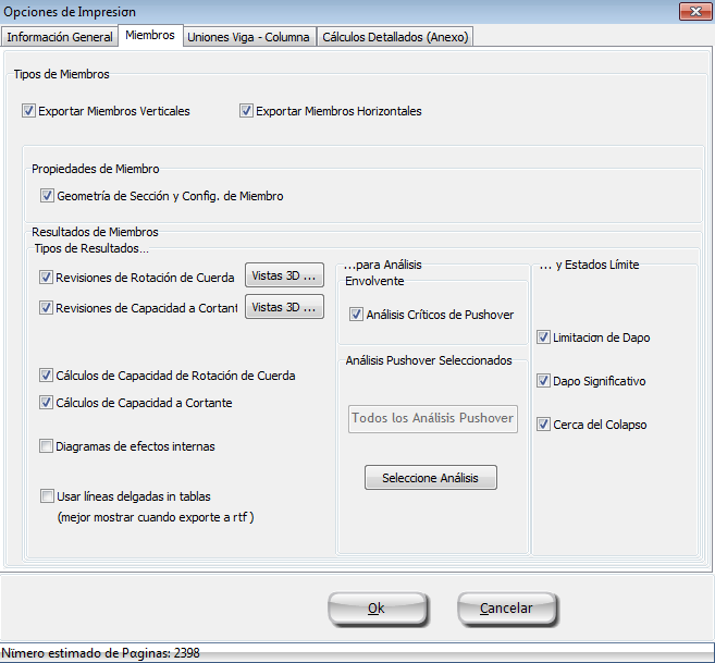 - La opción de seleccionar la envolvente de los análisis más críticos o los valores medios están disponibles. El último solo está disponible en el procedimiento dinámico no lineal. Sin embargo se pueden seleccionar análisis específicos mediante el botón de Seleccionar Análisis