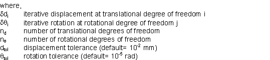 El criterio de desplazamiento/rotación consiste en verificar, para cada grado individual de libertad de la estructura, que el desplazamiento/rotación iterativo actual es menor o igual que una tolerancia especificada por el usuario. En otras palabras, si y cuando todos los valores del desplazamiento O rotación resultante de la aplicación de la vector de carga iterativa (fuera de balance) son menores o iguales a los factores de tolerancia de rotación / desplazamiento predefinidos, entonces se considera que la solución ha convergido. Este concepto puede ser matemáticamente Expresado de la siguiente manera: