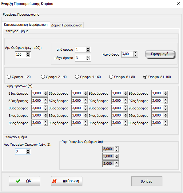 - Κατασκευαστική Διαμόρφωση: Στην καρτέλα Κατασκευαστική Διαμόρφωση ορίζονται ο αριθμός των ορόφων και τα ύψη τους. Δίνεται η επιλογή 1 έως 100 ορόφων, με διαφορετικά ύψη για κάθε όροφο ή εφαρμόζοντας ένα κοινό ύψος για ομάδα ορόφων. Επίσης μπορούν να οριστούν μέχρι τρεις υπόγειοι όροφοι και τα αντίστοιχα ύψη τους. Η προκαθορισμένη επιλογή για αυτή την ενότητα είναι 3 όροφοι με 3m ύψος ο καθένας χωρίς υπόγειους ορόφους.