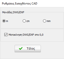 . Εμφανίζεται ένα παράθυρο για την επιλογή μονάδων του DWG/DXF και δίνεται η δυνατότητα στο χρήστη να αντιστοιχήσει την αρχή των αξόνων του σχεδίου στις συντεταγμένες (0,0) του αρχείου CAD.