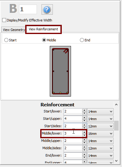 Ακόμη, ο διαμήκης και εγκάρσιος οπλισμός μπορεί να οριστεί μέσω των σχετικών διατάξεων οπλισμού. Διαφορετικές διατάξεις οπλισμού μπορούν να οριστούν στο μέσο και στα δύο άκρα της δοκού. Η προσθήκη μεμονωμένων διαμήκων ράβδων οπλισμού μπορεί επίσης να πραγματοποιηθεί μέσω της αντίστοιχης ενότητας Πρόσθετες Ράβδοι, όπου ο πρόσθετος οπλισμός μπορεί να εισαχθεί γραφικά.