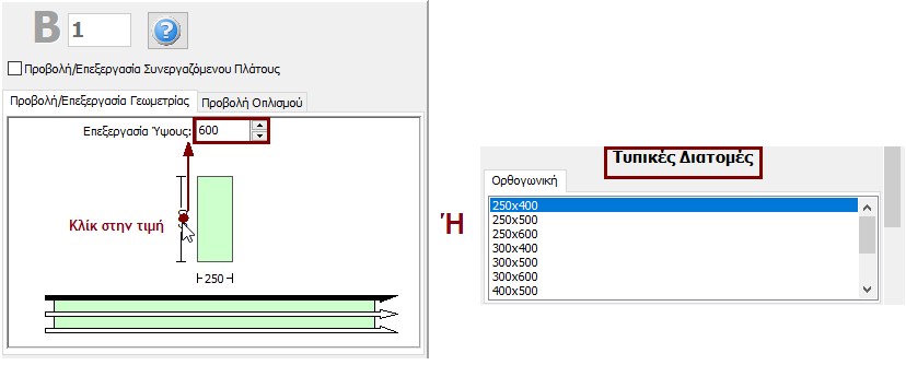 Στο Παράθυρο Ιδιοτήτων που εμφανίζεται, οι χρήστες μπορούν να προσαρμόσουν τις διαστάσεις της διατομής είτε στο παράθυρο Προβολή/Επεξεργασία Γεωμετρίας είτε επιλέγοντας μια διατομή από τις προκαθορισμένες τυπικές διατομές.