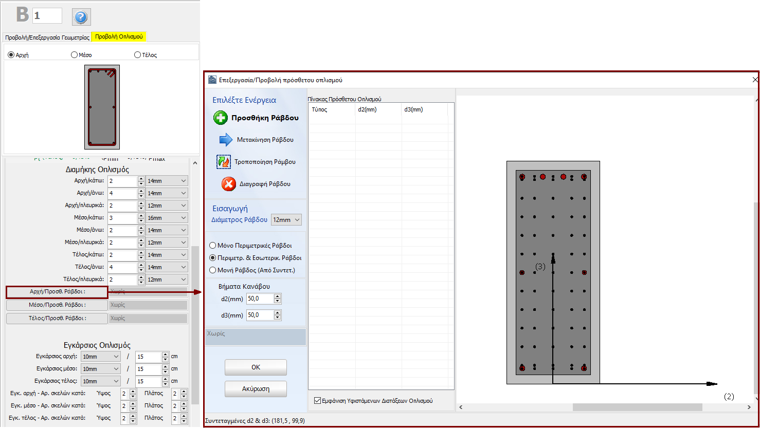 Με την επεξεργασία των διατάξεων οπλισμού το πρόγραμμα αυτομάτως μεταφέρεται στην Προβολή Οπλισμού, όπου προβάλλεται ο οπλισμός της διατομής στην αρχή, στο μέσο και στο τέλος (διαμήκης και εγκάρσιος) και μπορεί να ελεγχθεί η σωστή εισαγωγή του.