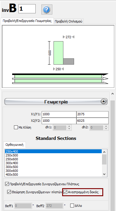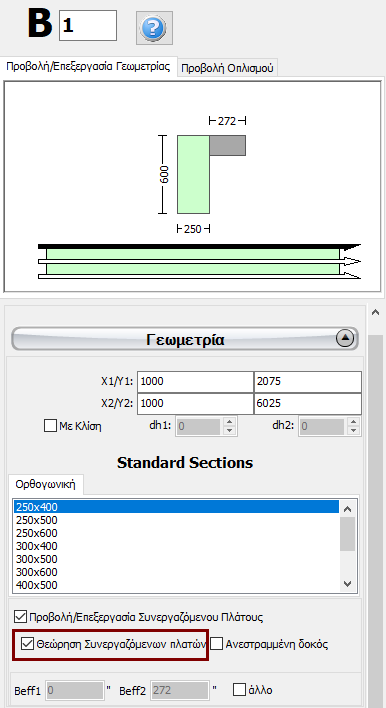 Μετά τον ορισμό των πλακών, δύναται να εμφανιστούν δύο πρόσθετες επιλογές στο Παράθυρο Ιδιοτήτων των δοκών: (i) επιλογή για το αν θα συμπεριληφθεί ή όχι το συνεργαζόμενο πλάτος των δοκών στους υπολογισμούς και (ii) επιλογή για το αν η δοκός είναι ανεστραμμένη ή όχι. Το συνεργαζόμενο πλάτος υπολογίζεται αυτόματα από το πρόγραμμα, αλλά μπορεί επίσης να τροποποιηθεί από το χρήστη.