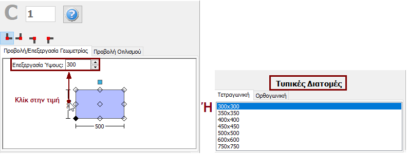 Στο Παράθυρο Ιδιοτήτων που εμφανίζεται, οι χρήστες μπορούν να προσαρμόσουν τις διαστάσεις της διατομής είτε στο παράθυρο Προβολή/Επεξεργασία Γεωμετρίας είτε επιλέγοντας μια διατομή από τις προκαθορισμένες τυπικές διατομές.