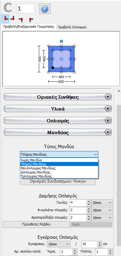 της γραμμής εργαλείων, ή μέσω του κουμπιού Ορισμός Συνδυασμών Υλικών στο Παράθυρο Ιδιοτήτων του μέλους. Σημειώνεται ότι υπάρχει δυνατότητα ορισμού διαφορετικών συνδυασμών υλικών στα υποστυλώματα με μανδύα για το εσωτερικό τμήμα (υφιστάμενο) και τον μανδύα (νέο).