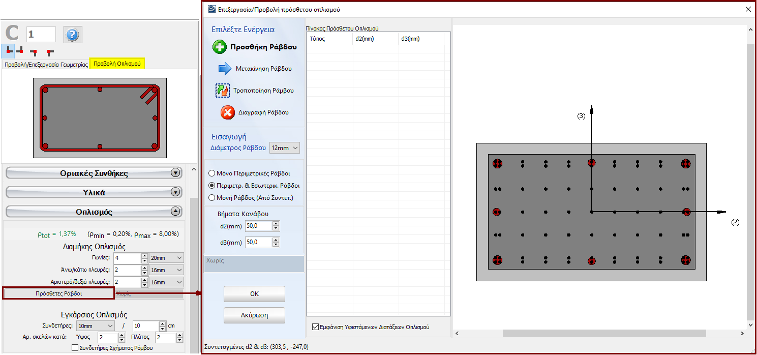 Ο διαμήκης και εγκάρσιος οπλισμός μπορεί να οριστεί με την επεξεργασία των σχετικών διατάξεων οπλισμού. Η προσθήκη μεμονωμένων διαμήκων ράβδων οπλισμού μπορεί επίσης να πραγματοποιηθεί μέσω της αντίστοιχης ενότητας Πρόσθετες Ράβδοι, όπου ο πρόσθετος οπλισμός μπορεί να εισαχθεί γραφικά.