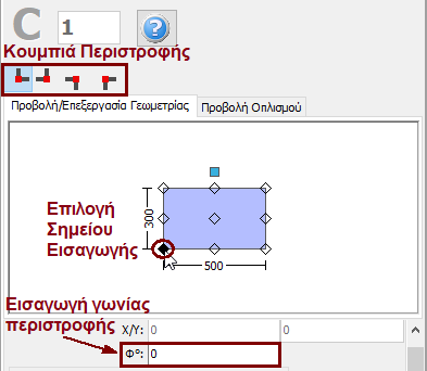 Υπάρχει δυνατότητα επιλογής του σημείου εισαγωγής (το σημείο της διατομής που αντιστοιχεί στη θέση του κλικ του ποντικιού) κάνοντας κλικ στη γωνία, στη μέση ή σε σημείο της παρειάς της διατομής στο Παράθυρο Ιδιοτήτων, όπου επίσης μπορεί να προβληθεί και να τροποποιηθεί η περιστροφή του υποστυλώματος κατά 0o, 90o, 180o και 270o ή εισάγοντας την κατάλληλη γωνία στο αντίστοιχο πεδίο του Παραθύρου Ιδιοτήτων.