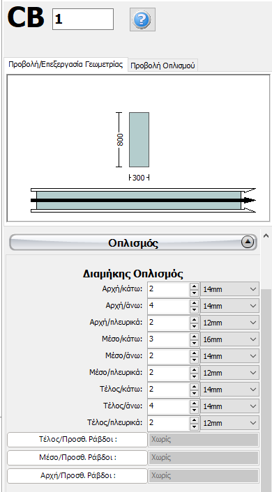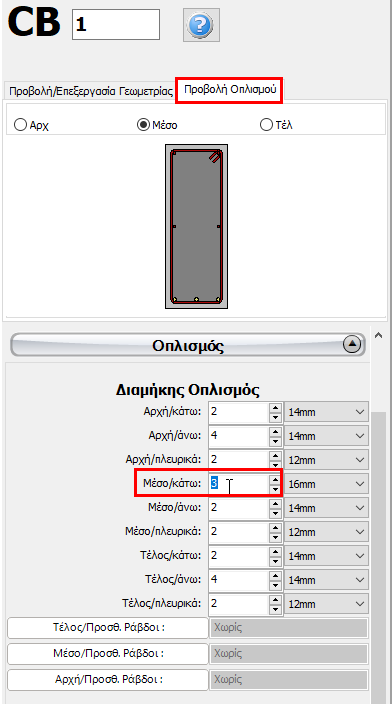 Ο διαμήκης και εγκάρσιος οπλισμός μπορεί να οριστεί μέσω των σχετικών διατάξεων οπλισμού. Διαφορετικές διατάξεις οπλισμού μπορούν να οριστούν στο μέσο και στα δύο άκρα της συνδετήριας δοκού.