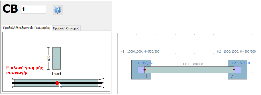 Μετά τον ορισμό όλων των ιδιοτήτων της διατομής, το νέο μέλος μπορεί να προστεθεί με δύο κλικ στο Κύριο Παράθυρο του Προσομοιωτή Κτιρίου, τα οποία ορίζουν την αρχή και το τέλος της δοκού. Η γραμμή εισαγωγής μπορεί να βρίσκεται στο κέντρο ή σε οποιαδήποτε από τις δύο πλευρές της δοκού. Αυτό μπορεί να οριστεί κάνοντας κλικ σε οποιαδήποτε από τις τρεις γραμμές στο παράθυρο Προβολή/Επεξεργασία Γεωμετρίας (η μαύρη γραμμή είναι η επιλεγμένη γραμμή).