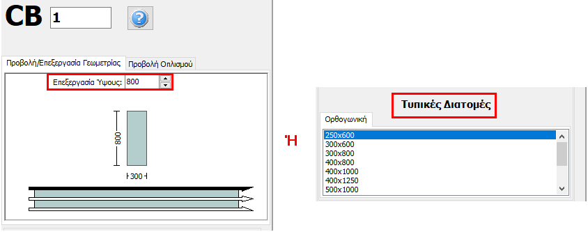 Στο Παράθυρο Ιδιοτήτων που εμφανίζεται, οι χρήστες μπορούν να προσαρμόσουν τις διαστάσεις της διατομής είτε στο παράθυρο Προβολή/Επεξεργασία Γεωμετρίας είτε επιλέγοντας μια διατομή από τις προκαθορισμένες τυπικές διατομές.