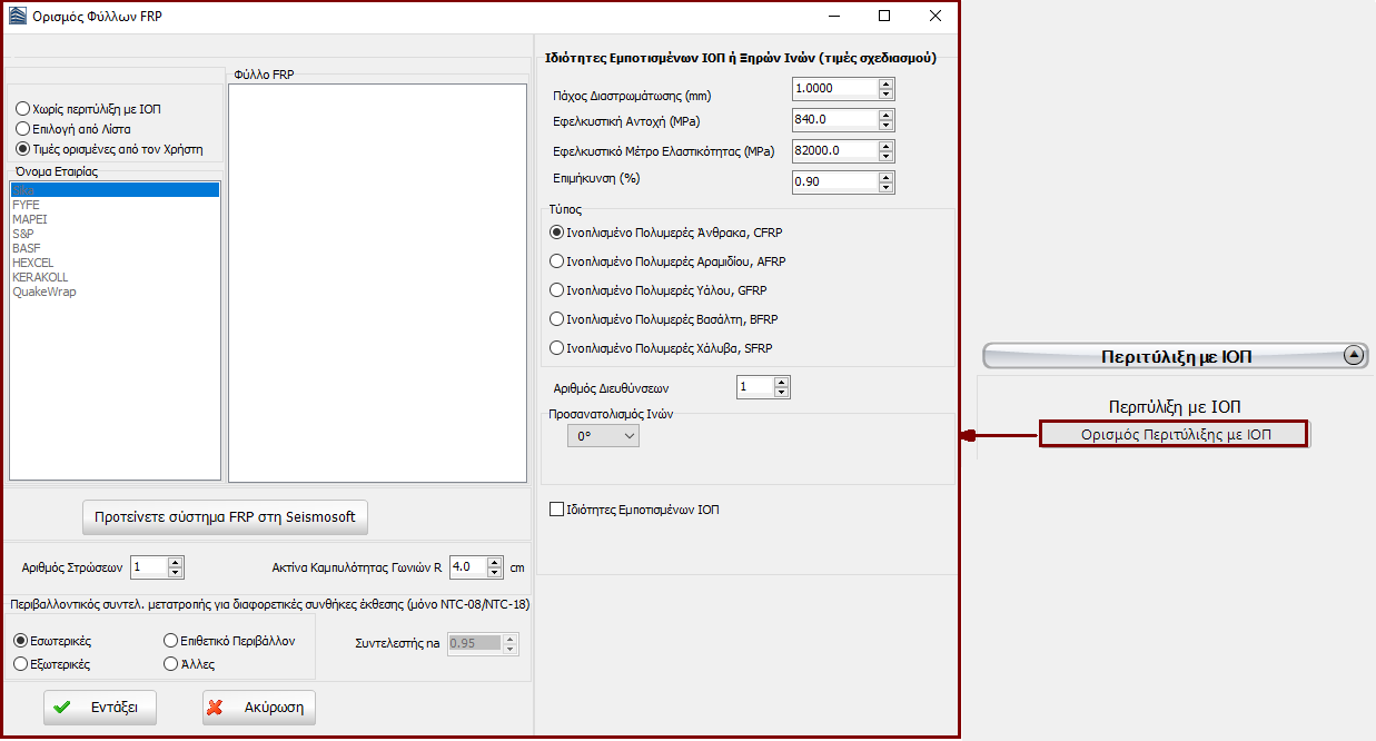 Ακόμη, υφάσματα ΙΟΠ μπορούν να οριστούν σε στοιχεία υποστυλώματος μέσω της ενότητας Ορισμός Περιτύλιξης με ΙΟΠ, όπου οι χρήστες μπορούν να επιλέξουν το ύφασμα ΙΟΠ από μια λίστα με τα πιο συνήθη προϊόντα, που διατίθενται στην αγορά, ή να εισάγουν τιμές της επιλογής τους.