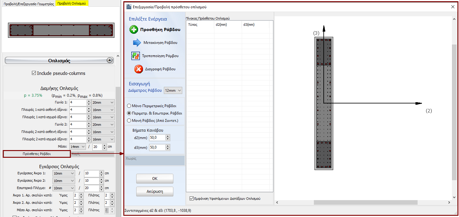 Σημείωση: Οι χρήστες πρέπει πρώτα να εισάγουν τη διατομή του τοιχίου στο μοντέλο, ώστε να έχουν ορίσει εντελώς τις διαστάσεις του τοιχίου, που είναι το συνολικό μήκος του τοιχίου και το πλάτος των ψευδο-υποστυλωμάτων προκειμένου να προσθέσουν ράβδους διαμήκους οπλισμού μέσω της ενότητας Πρόσθετες Ράβδοι.
