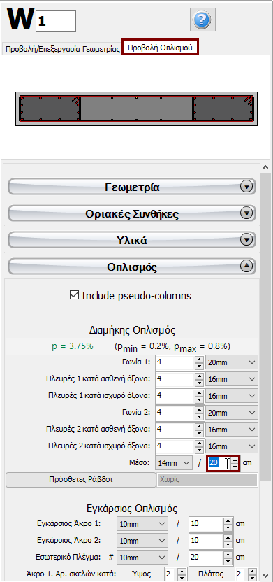 Στο Παράθυρο Ιδιοτήτων που εμφανίζεται, οι χρήστες μπορούν να προσαρμόσουν τις διαστάσεις του πλάτους της διατομής στο παράθυρο Προβολή/Επεξεργασία Γεωμετρίας ενώ το μήκος ορίζεται γραφικά με την εισαγωγή του, ορίζοντας δύο σημεία, αρχή και τέλος. Αρχικά, το πλάτος του ψευδό-υποστυλώματος υπολογίζεται αυτόματα ως το ένα πέμπτο (1/5) του συνολικού μήκους τοιχίου με μέγιστη τιμή ίση με 600mm. Μετά την εισαγωγή του τοιχίου, υπάρχει δυνατότητα τροποποίησής του στο Παράθυρο Ιδιοτήτων.