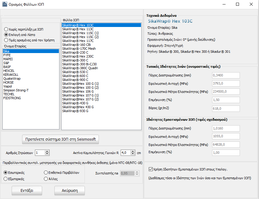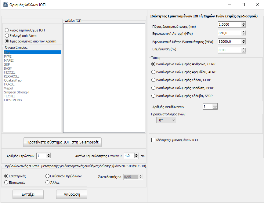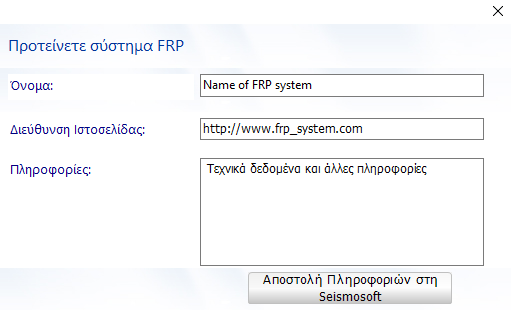Τέλος, μπορούν να προταθούν στη Seismosoft συστήματα ΙΟΠ μέσω του κουμπιού Προτείνετε σύστημα FRP στη Seismosoft. Εδώ καλείται ο χρήστης να ορίσει το όνομα για το σύστημα ΙΟΠ, το σύνδεσμο για τις πληροφορίες του προϊόντος και τις τεχνικές ιδιότητες του υφάσματος ΙΟΠ.
