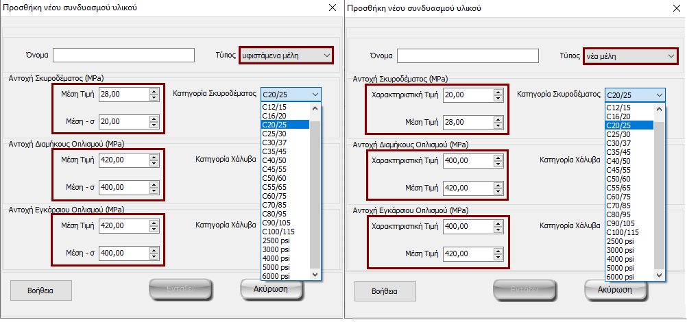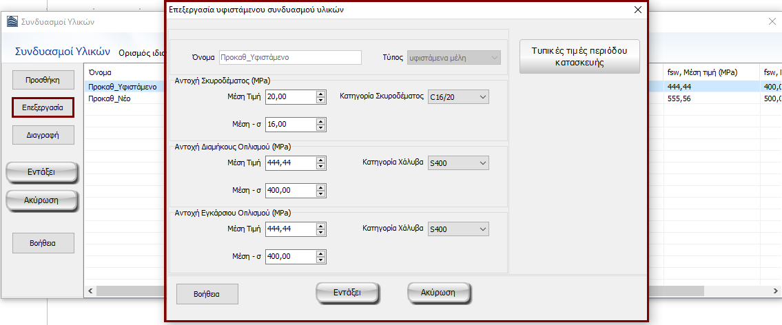 της γραμμής εργαλείων, ή μέσω του κουμπιού Ορισμός Συνδυασμών Υλικών στο Παράθυρο Ιδιοτήτων των μελών. Οι απαιτούμενες τιμές για τον ορισμό των ιδιοτήτων των υλικών εξαρτώνται από τον τύπο των μελών, δηλαδή υφιστάμενα ή νέα μέλη. Για τα υφιστάμενα υλικά απαιτείται η μέση τιμή αντοχής και η μέση τιμή μειωμένη κατά την τυπική απόκλιση, ενώ για τα νέα υλικά πρέπει να ορίζεται η χαρακτηριστική τιμή αντοχής και η μέση τιμή.