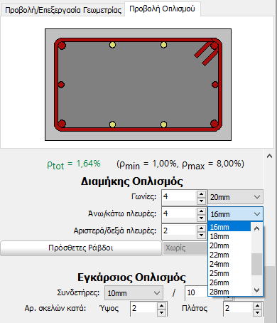 Επιπλέον, ο εγκάρσιος οπλισμός μπορεί να προσδιοριστεί, σε όρους διαμέτρου και σκελών συνδετήρων, καθώς επίσης και η απόσταση μεταξύ των συνδετήρων.