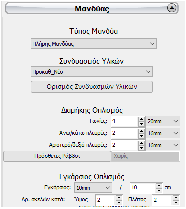 Μπορεί να οριστεί ο συνδυασμός υλικών των διατομών με μανδύα, καθώς και ο διαμήκης και εγκάρσιος οπλισμός του μανδύα.