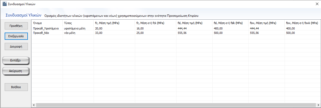 της γραμμής εργαλείων, ή μέσω του κουμπιού Ορισμός Συνδυασμών Υλικών στο παράθυρο με τις ιδιότητες των μελών. Οι απαιτούμενες τιμές για τον ορισμό των ιδιοτήτων των υλικών εξαρτώνται από τον τύπο των μελών, δηλαδή υφιστάμενα ή νέα μέλη. Για τα υφιστάμενα υλικά απαιτείται η μέση τιμή αντοχής και η μέση τιμή μειωμένη κατά την τυπική απόκλιση, ενώ για τα νέα υλικά πρέπει να ορίζεται η χαρακτηριστική τιμή αντοχής και η μέση τιμή. Από προεπιλογή υπάρχουν δύο συνδυασμοί υλικών, ένας για τα υφιστάμενα στοιχεία και ένας για τα νέα. Οι χρήστες μπορούν να τροποποιήσουν τις τιμές των προκαθορισμένων συνδυασμών και να προσθέσουν νέους συνδυασμούς υλικών για την κάλυψη των αναγκών του μοντέλου τους (π.χ. όταν χρησιμοποιούνται υλικά με διαφορετικές τιμές αντοχής).