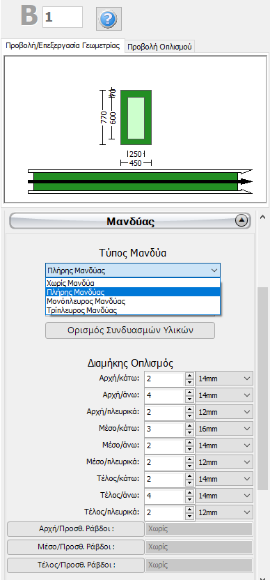 Μανδύες ΟΣ μπορούν να εφαρμοστούν στη διατομή επιλέγοντας τον τύπο του μανδύα στην ενότητα Μανδύας, δηλαδή αν είναι πλήρης μανδύας, μονόπλευρος, ή τρίπλευρος, και ορίζοντας τον συνδυασμό υλικών και τον διαμήκη και εγκάρσιο οπλισμό του μανδύα.