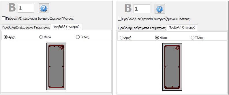 Στο Παράθυρο Ιδιοτήτων οι χρήστες μπορούν να επιλέξουν την Προβολή Οπλισμού, όπου εμφανίζεται ο διαμήκης οπλισμός της διατομής στην αρχή, στο μέσο και στο τέλος και μπορεί να ελεγχθεί η σωστή εισαγωγή του.