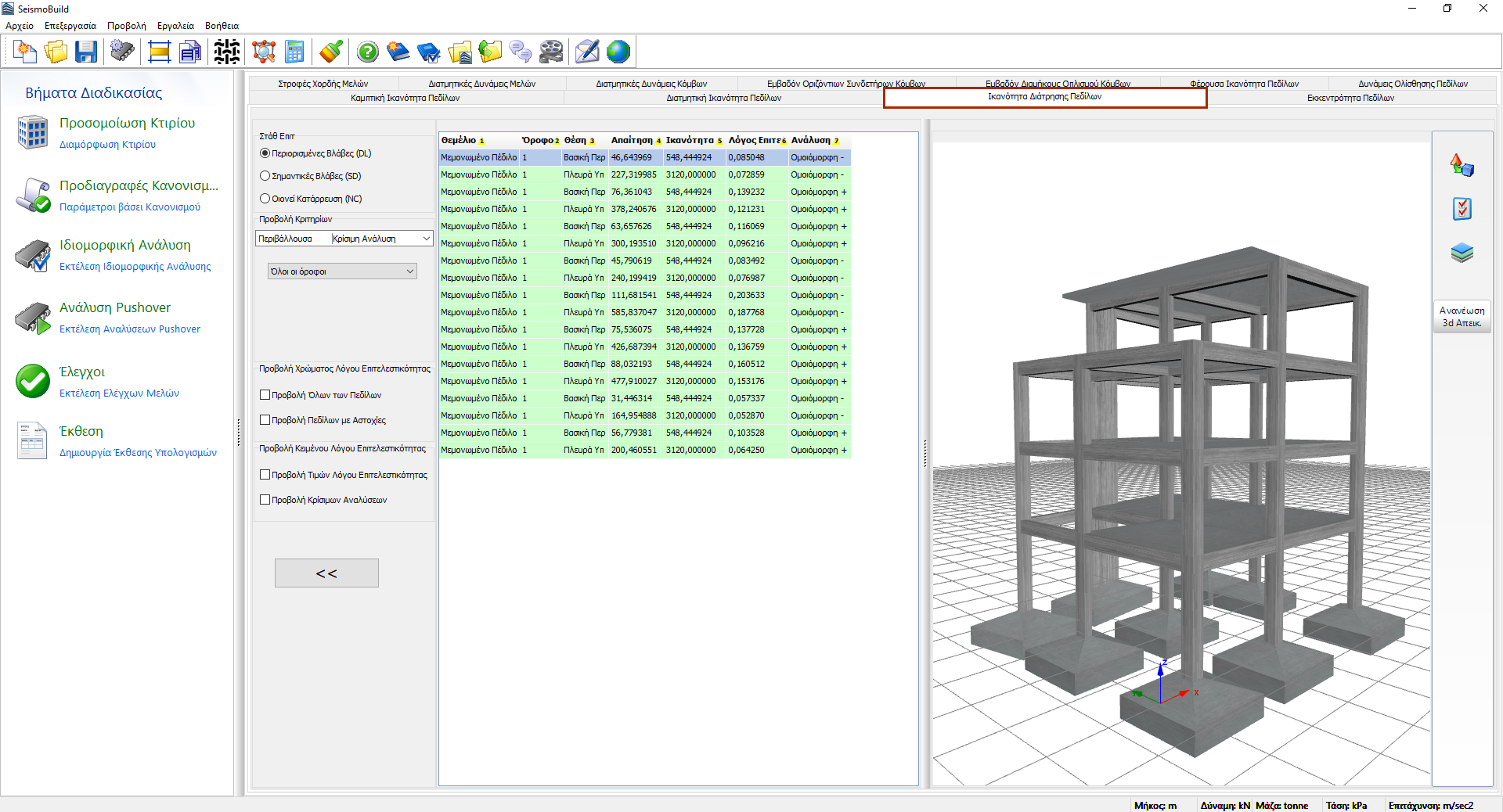 Τα αποτελέσματα των ελέγχων ικανότητας διάτρησης για μεμονωμένα πέδιλα και πεδιλοδοκούς, σύμφωνα με τον επιλεγμένο Κανονισμό, μπορούν να απεικονιστούν σε αυτήν την ενότητα. Οι χρήστες μπορούν να επιλέξουν για ποιες Στάθμες Επιτελεστικότητας να δουν τα αποτελέσματα καθώς και τα Κριτήρια Προβολής, τα οποία περιλαμβάνουν την ανάλυση, τον όροφο και τον τοπικό άξονα. Οι διαθέσιμες στάθμες επιτελεστικότητας είναι εκείνες που έχουν ήδη επιλεγεί στην ενότητα Στάθμες Επιτελεστικότητας στις Προδιαγραφές Κανονισμού. Επιπλέον, στο αναδυόμενο μενού για την επιλογή ανάλυσης εκτός από τις εκτελεσθείσες αναλύσεις, υπάρχει μια επιλογή που ονομάζεται Κρίσιμη Ανάλυση, η οποία είναι η περιβάλλουσα των αποτελεσμάτων όλων των αναλύσεων. Τα στοιχεία που έχουν υπερβεί την ικανότητα διάτρησης επισημαίνονται με κόκκινο χρώμα τόσο στην προβολή πίνακα όσο και στη 3D μορφή προβολής όπου διαφορετικές επιλογές απεικόνισης είναι διαθέσιμες. Για παράδειγμα οι χρήστες μπορεί να επιλέξουν να εμφανίζεται ο λόγος ικανότητας πεδίλου ή η κρίσιμη ανάλυση για κάθε πέδιλο στη 3D απεικόνιση, ή να εμφανίζονται τα πέδιλα με διαφορετικά χρώματα, βάσει της τιμής του λόγου ικανότητάς τους για την επιλεγμένη στάθμη επιτελεστικότητας.