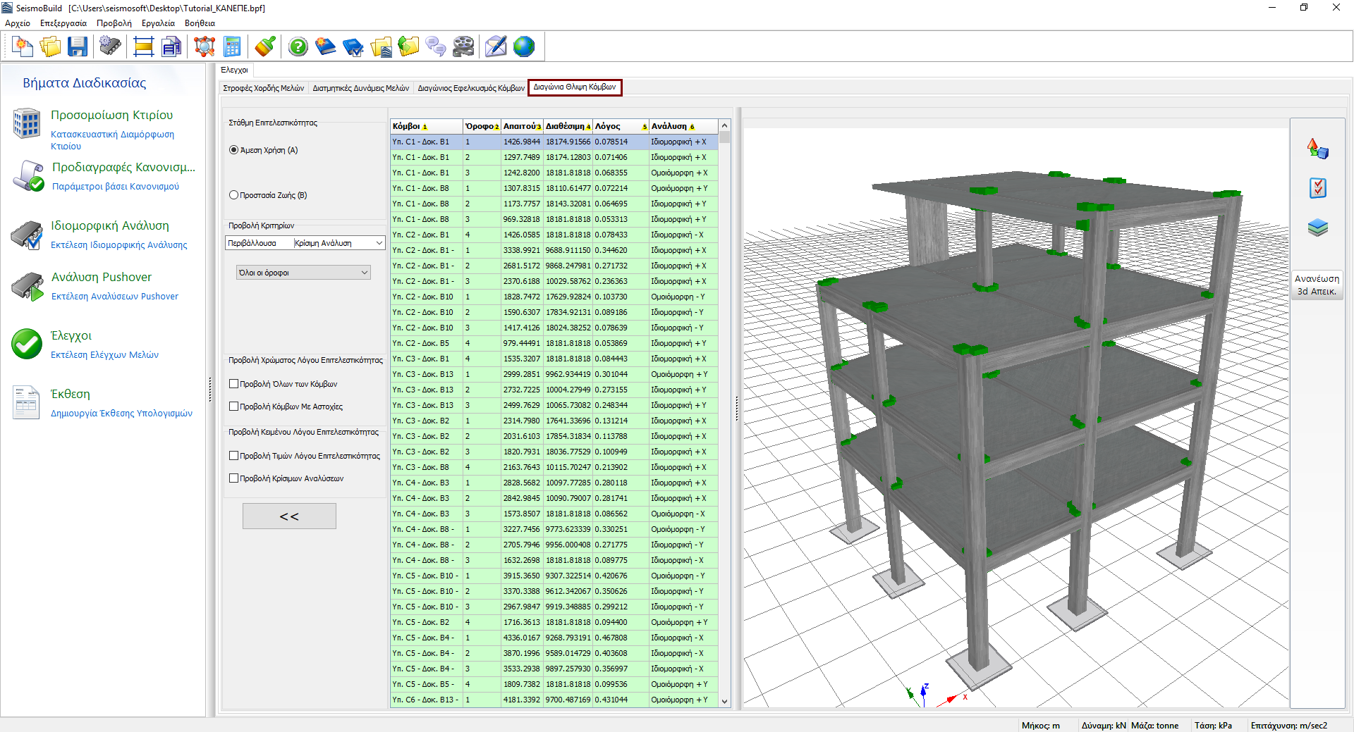 Εδώ παρουσιάζονται τα αποτελέσματα των ελέγχων των διαγώνιων θλιπτικών τάσεων κόμβων δοκού-υποστυλώματος (αυτός ο έλεγχος ισχύει για NTC και ΚΑΝ.ΕΠΕ.). Οι χρήστες μπορούν να επιλέξουν για ποιες Στάθμες Επιτελεστικότητας να δουν τα αποτελέσματα καθώς και τα Κριτήρια Προβολής, τα οποία περιλαμβάνουν την ανάλυση και τον όροφο. Οι διαθέσιμες στάθμες επιτελεστικότητας είναι εκείνες που έχουν ήδη επιλεγεί στην ενότητα Στάθμες Επιτελεστικότητας στις Προδιαγραφές Κανονισμού. Επιπλέον, στο αναδυόμενο μενού για την επιλογή ανάλυσης εκτός από τις εκτελεσθείσες αναλύσεις, υπάρχει μια επιλογή που ονομάζεται Κρίσιμη Ανάλυση, η οποία είναι η περιβάλλουσα των αποτελεσμάτων όλων των αναλύσεων. Τα στοιχεία τα οποία έχουν ξεπεράσει την ικανότητα διαγώνιας θλιπτικής τάσης τους, επισημαίνονται με κόκκινο χρώμα τόσο στην προβολή πίνακα όσο και στη 3D μορφή προβολής όπου διαφορετικές επιλογές απεικόνισης είναι διαθέσιμες. Για παράδειγμα οι χρήστες μπορεί να επιλέξουν να εμφανίζεται ο λόγος επιτελεστικότητας μέλους ή η κρίσιμη ανάλυση για κάθε μέλος στη 3D απεικόνιση, ή να εμφανίζονται τα στοιχεία με διαφορετικά χρώματα, βάσει της τιμής του λόγου επιτελεστικότητάς τους για την επιλεγμένη στάθμη επιτελεστικότητας.