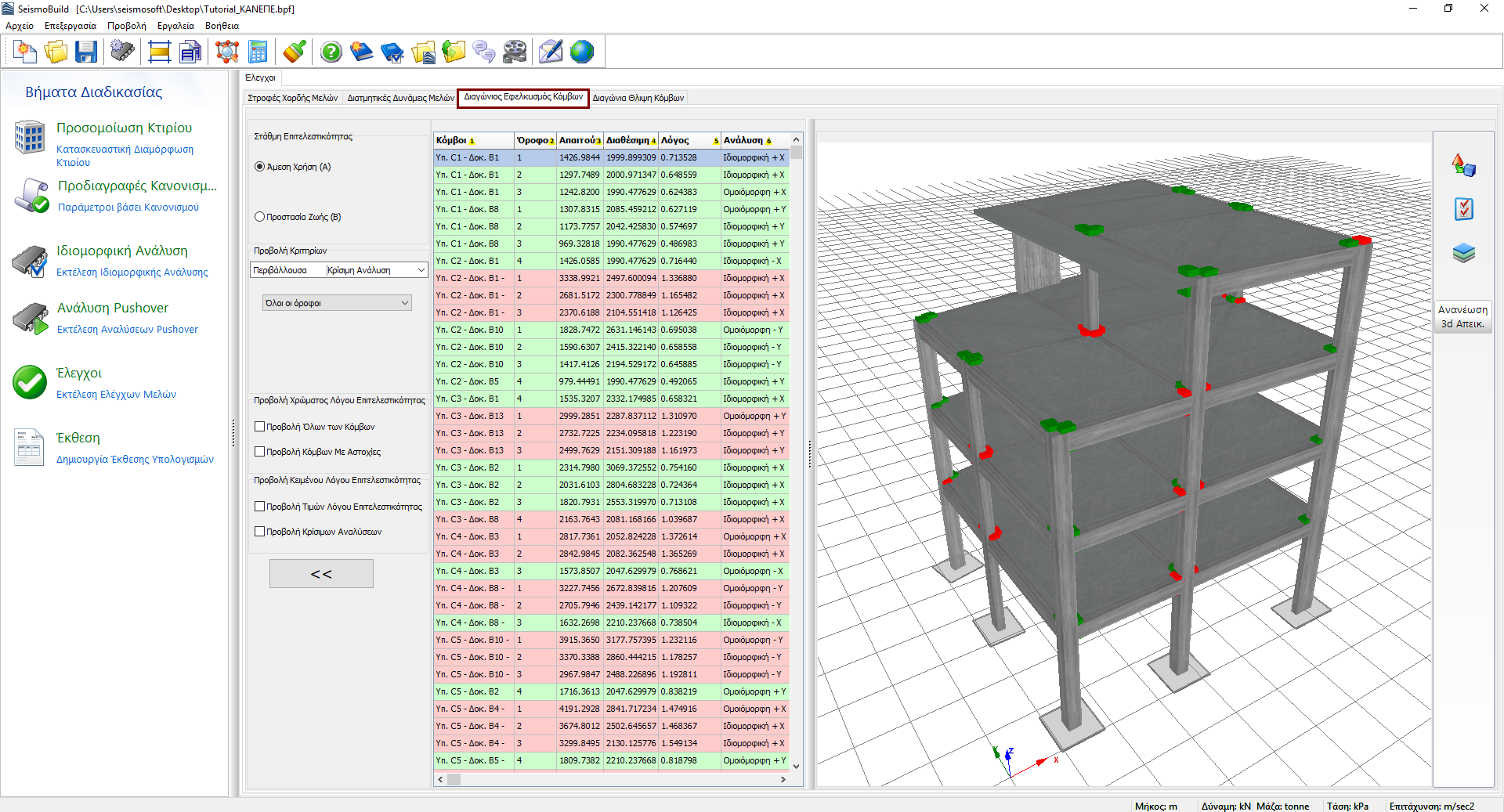Εδώ παρουσιάζονται τα αποτελέσματα των ελέγχων των διαγώνιων εφελκυστικών τάσεων κόμβων δοκού-υποστυλώματος (αυτός ο έλεγχος ισχύει για NTC και ΚΑΝ.ΕΠΕ.). Οι χρήστες μπορούν να επιλέξουν για ποιες Στάθμες Επιτελεστικότητας να δουν τα αποτελέσματα καθώς και τα Κριτήρια Προβολής, τα οποία περιλαμβάνουν την ανάλυση και τον όροφο. Οι διαθέσιμες στάθμες επιτελεστικότητας είναι εκείνες που έχουν ήδη επιλεγεί στην ενότητα Στάθμες Επιτελεστικότητας στις Προδιαγραφές Κανονισμού. Επιπλέον, στο αναδυόμενο μενού για την επιλογή ανάλυσης εκτός από τις εκτελεσθείσες αναλύσεις, υπάρχει μια επιλογή που ονομάζεται Κρίσιμη Ανάλυση, η οποία είναι η περιβάλλουσα των αποτελεσμάτων όλων των αναλύσεων. Τα στοιχεία τα οποία έχουν ξεπεράσει την ικανότητα διαγώνιας εφελκυστικής τάσης τους, επισημαίνονται με κόκκινο χρώμα τόσο στην προβολή πίνακα όσο και στη 3D απεικόνιση όπου διαφορετικές επιλογές απεικόνισης είναι διαθέσιμες. Για παράδειγμα οι χρήστες μπορεί να επιλέξουν να εμφανίζεται ο λόγος επιτελεστικότητας μέλους ή η κρίσιμη ανάλυση για κάθε μέλος στη 3D απεικόνιση, ή να εμφανίζονται τα στοιχεία με διαφορετικά χρώματα, βάσει της τιμής του λόγου επιτελεστικότητάς τους για την επιλεγμένη στάθμη επιτελεστικότητας.