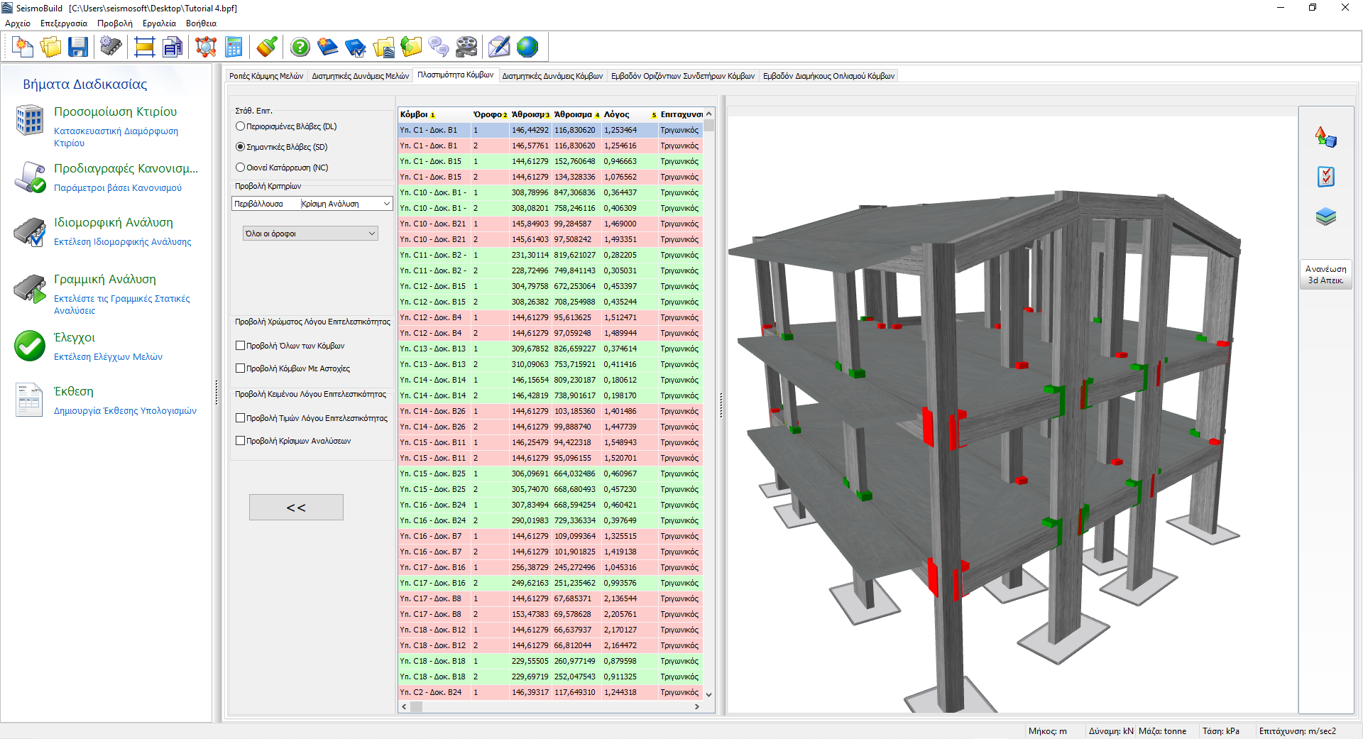 Εδώ παρουσιάζονται τα αποτελέσματα των ελέγχων πλαστιμότητας κόμβων. Οι χρήστες μπορούν να επιλέξουν για ποιες Στάθμες Επιτελεστικότητας να δουν τα αποτελέσματα και να επιλέξουν φίλτρα, τα οποία περιλαμβάνουν την ανάλυση και τον όροφο. Οι διαθέσιμες στάθμες επιτελεστικότητας είναι εκείνες που έχουν ήδη επιλεγεί στην ενότητα Στάθμες Επιτελεστικότητας στις Προδιαγραφές Κανονισμού. Επιπλέον, στο αναδυόμενο μενού για την επιλογή ανάλυσης εκτός από τις εκτελεσθείσες αναλύσεις υπάρχει μια επιλογή που ονομάζεται Κρίσιμη Ανάλυση, η οποία είναι η περιβάλλουσα των αποτελεσμάτων όλων των αναλύσεων. Τα στοιχεία τα οποία φτάνουν την ικανότητά τους σε πλαστιμότητα επισημαίνονται με κόκκινο χρώμα τόσο στην προβολή πίνακα όσο και στη 3D μορφή προβολής όπου διαφορετικές επιλογές απεικόνισης είναι διαθέσιμες. Για παράδειγμα οι χρήστες μπορεί να επιλέξουν να εμφανίζεται ο λόγος ικανότητας μέλους ή η κρίσιμη ανάλυση για κάθε μέλος στη 3D απεικόνιση, ή να εμφανίζονται τα στοιχεία με διαφορετικά χρώματα, βάσει της τιμής του λόγου ικανότητάς τους για την επιλεγμένη στάθμη επιτελεστικότητας.