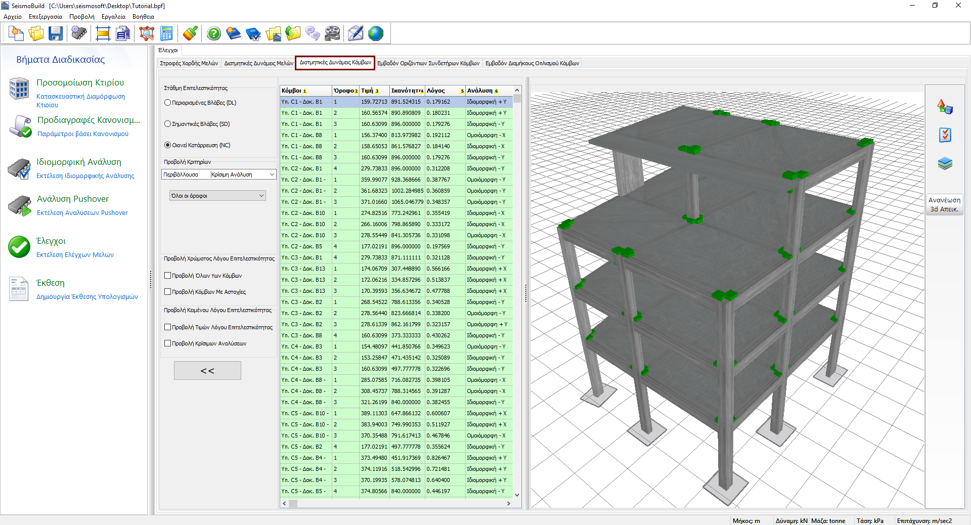 Εδώ εξάγονται τα αποτελέσματα των ελέγχων των διατμητικών δυνάμεων για τους κόμβους δοκού-υποστυλώματος. Οι χρήστες μπορούν να επιλέξουν για ποια Στάθμη Επιτελεστικότητας να δουν τα αποτελέσματα και να επιλέξουν φίλτρα, τα οποία περιλαμβάνουν την ανάλυση και τον όροφο. Οι διαθέσιμες στάθμες επιτελεστικότητας είναι εκείνες που έχουν ήδη επιλεγεί στην ενότητα Στάθμες Επιτελεστικότητας στις Προδιαγραφές Κανονισμού. Επιπλέον, στο αναδυόμενο μενού για την επιλογή ανάλυσης, εκτός από τις εκτελεσθείσες αναλύσεις υπάρχει μια επιλογή που ονομάζεται Κρίσιμη Ανάλυση, η οποία είναι η περιβάλλουσα των αποτελεσμάτων όλων των αναλύσεων. Τα στοιχεία που έχουν υπερβεί την ικανότητά τους σε διάτμηση, σημειώνονται με κόκκινο χρώμα τόσο στην προβολή πίνακα όσο και στη 3D απεικόνιση όπου διαφορετικές επιλογές απεικόνισης είναι διαθέσιμες. Για παράδειγμα οι χρήστες μπορεί να επιλέξουν να εμφανίζεται ο λόγος επιτελεστικότητας μέλους ή η κρίσιμη ανάλυση για κάθε μέλος στη 3D απεικόνιση, ή να εμφανίζονται τα στοιχεία με διαφορετικά χρώματα, βάσει της τιμής του λόγου επιτελεστικότητάς τους για την επιλεγμένη στάθμη επιτελεστικότητας.