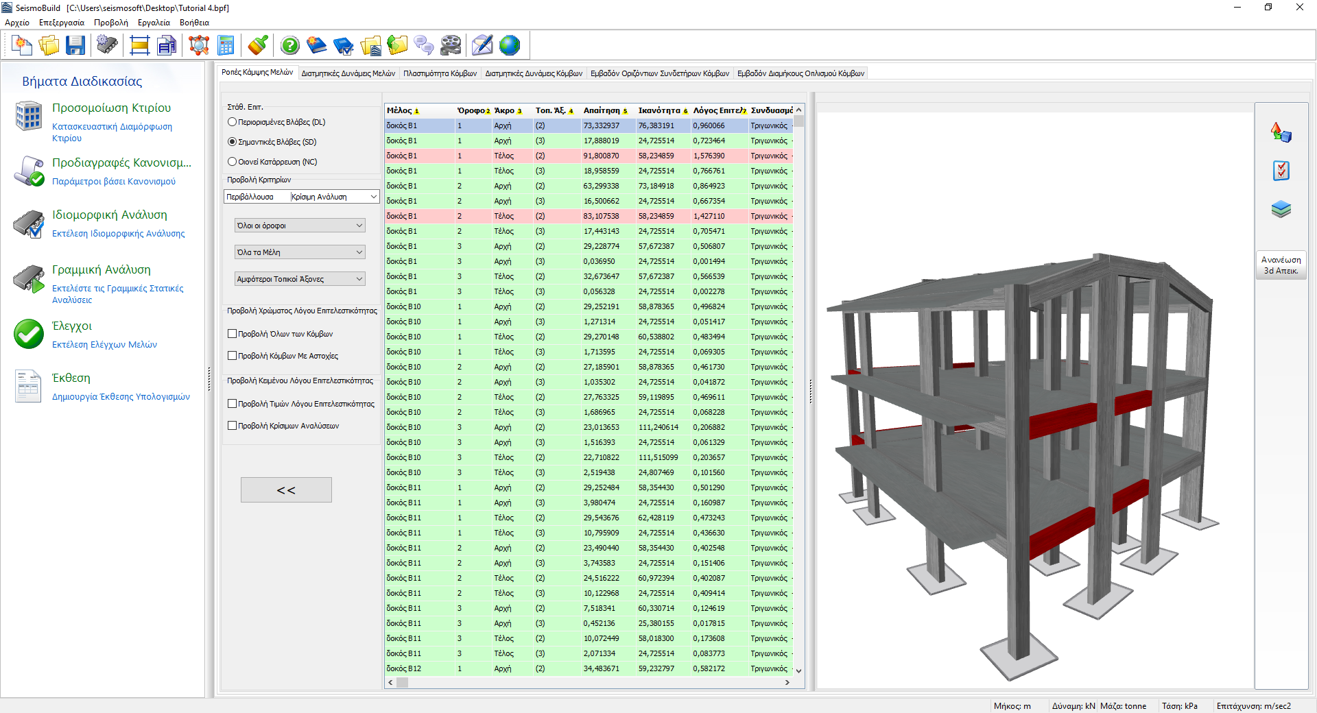 Σε αυτή την ενότητα εξάγονται τα αποτελέσματα των ελέγχων ροπών κάμψης δοκών, υποστυλωμάτων και τοιχίων, σύμφωνα με τον επιλεγμένο Κανονισμό. Οι χρήστες μπορούν να επιλέξουν για ποια Στάθμη Επιτελεστικότητας να δουν τα αποτελέσματα και να επιλέξουν φίλτρα, τα οποία περιλαμβάνουν την ανάλυση, τον όροφο, τον τύπο των στοιχείων και τον τοπικό άξονα. Οι διαθέσιμες στάθμες επιτελεστικότητας είναι εκείνες που έχουν ήδη επιλεγεί στην ενότητα Στάθμες Επιτελεστικότητας στις Προδιαγραφές Κανονισμού. Περαιτέρω, στο αναδυόμενο μενού για την επιλογή ανάλυσης, εκτός από τις εκτελεσθείσες αναλύσεις υπάρχει μια επιλογή που ονομάζεται Κρίσιμη Ανάλυση, η οποία είναι η περιβάλλουσα των αποτελεσμάτων όλων των αναλύσεων. Τα στοιχεία που έχουν υπερβεί την ικανότητά τους σε ροπή κάμψης, σημειώνονται με κόκκινο χρώμα τόσο στην προβολή πίνακα όσο και στη 3D μορφή προβολής, όπου διαφορετικές επιλογές απεικόνισης είναι διαθέσιμες. Για παράδειγμα οι χρήστες μπορεί να επιλέξουν να εμφανίζεται ο λόγος ικανότητας μέλους ή η κρίσιμη ανάλυση για κάθε μέλος στη 3D απεικόνιση, ή να εμφανίζονται τα στοιχεία με διαφορετικά χρώματα, βάσει της τιμής του λόγου ικανότητάς τους για την επιλεγμένη στάθμη επιτελεστικότητας.
