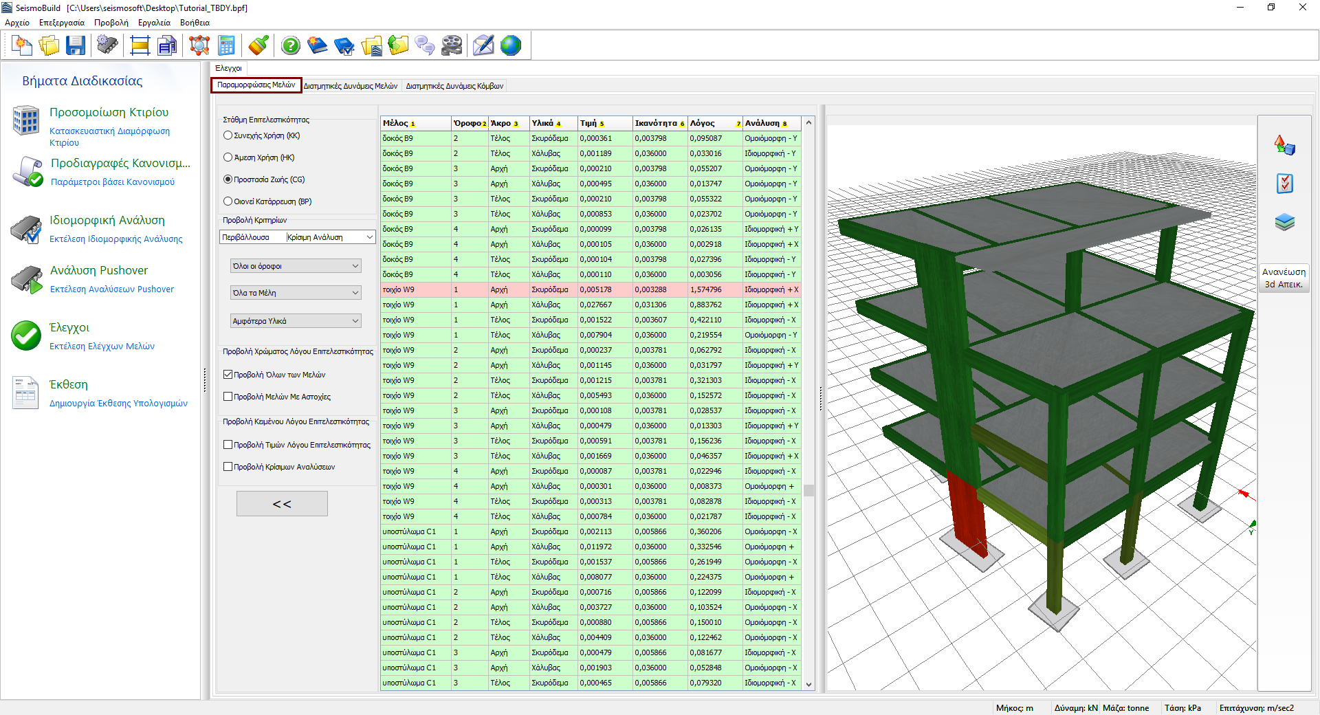 Τα αποτελέσματα της ικανότητας σε παραμόρφωση των δοκών, υποστυλωμάτων και τοιχίων, μπορούν αν απεικονισθούν σε αυτήν την ενότητα (αυτός ο έλεγχος εφαρμόζεται μόνο στον TBDY). Οι χρήστες μπορούν να επιλέξουν για ποια Στάθμη Επιτελεστικότητας, να δουν τα αποτελέσματα και να διαλέξουν φίλτρα, τα οποία περιλαμβάνουν τον προσδιορισμό της ανάλυσης, τον όροφο, τον τύπο του μέλους και τον τοπικό άξονα. Οι διαθέσιμες στάθμες επιτελεστικότητας είναι εκείνες που έχουν ήδη επιλεγεί από την ενότητα Στάθμες Επιτελεστικότητας στις Προδιαγραφές Κανονισμού. Επίσης, στο αναδυόμενο μενού για την επιλογή της ανάλυσης, εκτός από τις εκτελεσθείσες αναλύσεις, υπάρχει μια επιλογή που καλείται Κρίσιμη Ανάλυση, η οποία είναι η περιβάλλουσα των αποτελεσμάτων όλων των αναλύσεων. Τα στοιχεία που έχουν υπερβεί την ικανότητα τους σε παραμόρφωση, σημειώνονται με κόκκινο χρώμα τόσο στην προβολή πίνακα όσο και στη 3D απεικόνιση όπου διαφορετικές επιλογές απεικόνισης είναι διαθέσιμες. Για παράδειγμα οι χρήστες μπορεί να επιλέξουν να εμφανίζεται ο λόγος επιτελεστικότητας μέλους ή η κρίσιμη ανάλυση για κάθε μέλος στη 3D απεικόνιση, ή να εμφανίζονται τα στοιχεία με διαφορετικά χρώματα, βάσει της τιμής του λόγου επιτελεστικότητάς τους για την επιλεγμένη στάθμη επιτελεστικότητας.