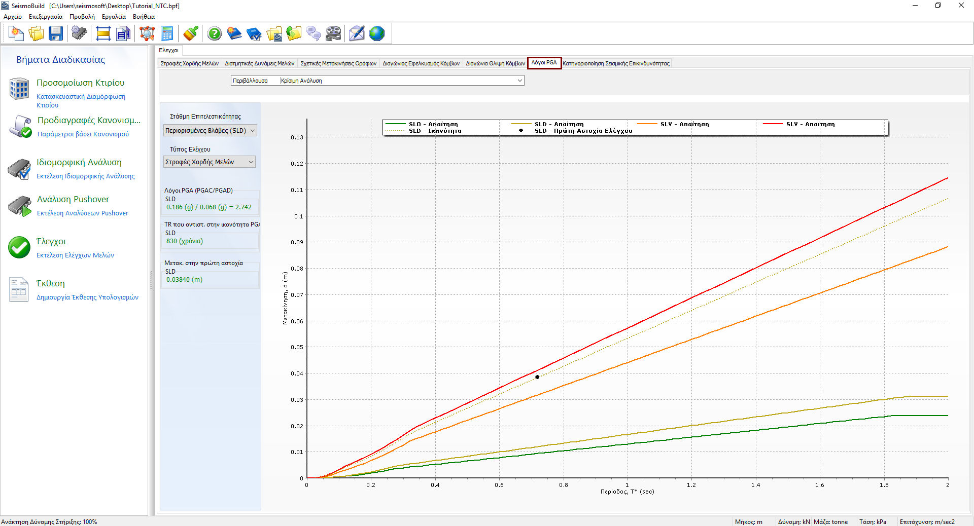 Οι λόγοι PGA (διαθέσιμοι μόνο στον NTC) παρέχουν μια γενική εκτίμηση της τρωτότητας της κατασκευής σε όρους μέγιστης εδαφικής επιτάχυνσης που μπορεί να αντέξει μια κατασκευή, συνεπώς είναι μια μέθοδος μέτρησης σεισμικού κινδύνου. Ορίζεται ως ο λόγος της Ικανότητας PGA, που αντιστοιχεί στη μετατόπιση της καμπύλης ικανότητας, στην οποία συμβαίνει η πρώτη αστοχία (σε οποιοδήποτε μέλος της κατασκευής), προς την Απαίτηση σε PGA, η οποία αντιστοιχεί στη Φασματική Επιτάχυνση που ορίζεται από τον χρήστη στην καρτέλα Σεισμικής Δράσης. Ο λόγος PGA υπολογίζεται για κάθε στάθμη επιτελεστικότητας, τύπο ελέγχου και ανελαστική στατική ανάλυση. Οι τιμές που είναι μεγαλύτερες της μονάδας (απεικονίζονται με πράσινο χρώμα) δείχνουν ότι δεν υπάρχει βλάβη για τον επιλεγμένο συνδυασμό στάθμης επιτελεστικότητας, τύπου ελέγχου και ανάλυσης, ενώ για τιμές μικρότερες της μονάδας (με κόκκινο χρώμα) αναμένονται βλάβες. Τιμές που είναι σημαντικά υψηλότερες της μονάδας δείχνουν ότι η κατασκευή μπορεί να αντέξει σεισμικά φορτία σχετικώς υψηλότερα από τη σεισμική δράση, που απαιτείται από τον κανονισμό, ενώ τιμές κοντά στο μηδέν δηλώνουν ότι η ικανότητα της κατασκευής είναι σημαντικά υποδεέστερη από την απαιτούμενη από τον κανονισμό. Στην καρτέλα λόγου PGA απεικονίζονται επίσης γραφικά η απαίτηση και η ικανότητα φάσματος απόκρισης μετακίνησης καθώς και η μετακίνηση στον πρώτο έλεγχο που αστοχεί. Επίσης εμφανίζεται η περίοδος επανάληψης που αντιστοιχεί στην ικανότητα PGA.