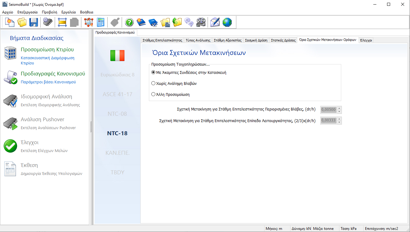 Στον ιταλικό κανονισμό NTC μπορεί να γίνει ένας επιπρόσθετος έλεγχος για τις στάθμες επιτελεστικότητας του Επιπέδου Λειτουργικότητας και των Περιορισμένων Βλαβών, όπως περιγράφεται στον NTC-18. Μέσω αυτής της ενότητας, οι χρήστες μπορούν να καθορίσουν αν οι τοιχοπληρώσεις θα θεωρηθούν ως άκαμπτα συνδεδεμένες με την κατασκευή ή αν αναμένεται να μην υποστούν βλάβη, προκειμένου να προσδιοριστεί η στοχευόμενη σχετική παραμόρφωση σε κάθε όροφο. Εναλλακτικά, οι χρήστες μπορούν να καθορίσουν τιμές που ορίζονται από τους ίδιους, διαλέγοντας την διαφορετική προσομοίωση.