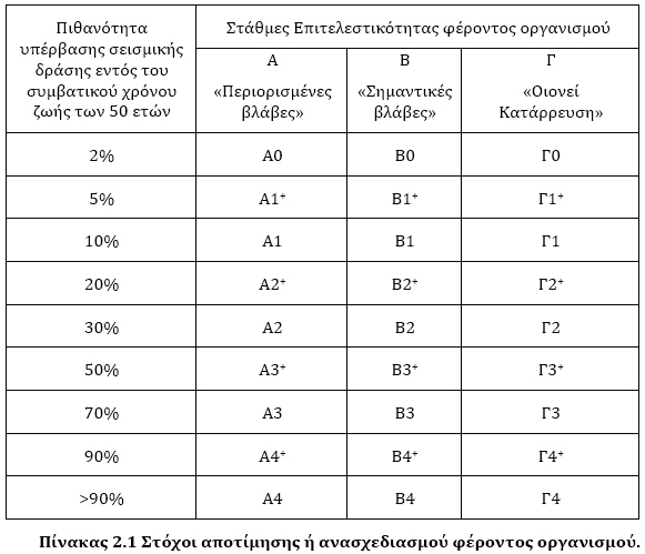 Η στοχευόμενη απόδοση του φέροντος οργανισμού αναφέρεται στο μέγεθος των ζημιών στην κατασκευή που ορίζεται μέσα από τρεις στάθμες επιτελεστικότητας, Περιορισμένες Βλάβες (Α), Σημαντικές Βλάβες (Β) και Οιονεί κατάρρευση (Γ).